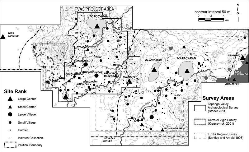In 2007-2011 I conducted a survey and settlement analysis in the Tepango River Valley as part of my doctoral work at the University of Kentucky. The objectives were to examine the settlement system surrounding the large Classic period center of Totocapan, possibly the largest site in the Tuxtla Mountains. Another primary goal was to identify economic trade relationships between Matacapan, a site with links to contemporary Teotihuacan in central Mexico, and Totocapan (see Ceramic Trade in the Tuxtla Mountains page). The results of survey and materials analysis showed that Totocapan loosely ruled over a settlement system in the Tepango Valley. XTENT modeling across the broader region suggested that Totocapan, Matacapan, and Teotepec divided up the southwestern Tuxtla mountains into peer polities, independent politically but interlinked through economic  exchanges.